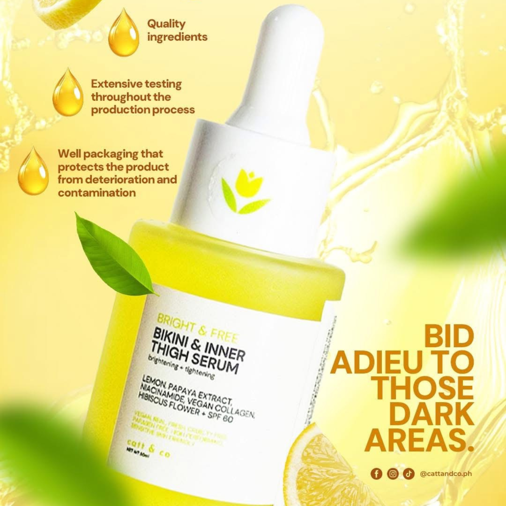 Catt & Co Bikini and Inner Thigh Serum is a gentle yet potent toning formula enriched with Lemon Burst and Papaya Extract to brighten, smooth, and rejuvenate delicate skin. This vegan, plant-based serum helps boost collagen production, improve skin texture, and promote the renewal of dull or tired cells for a firmer, more even-toned appearance. Specially formulated as both a brightening and anti-cellulite treatment, it helps reduce the appearance of dark lines, uneven tone, and roughness on the inner thighs and bikini area, leaving skin soft, radiant, and visibly refined.