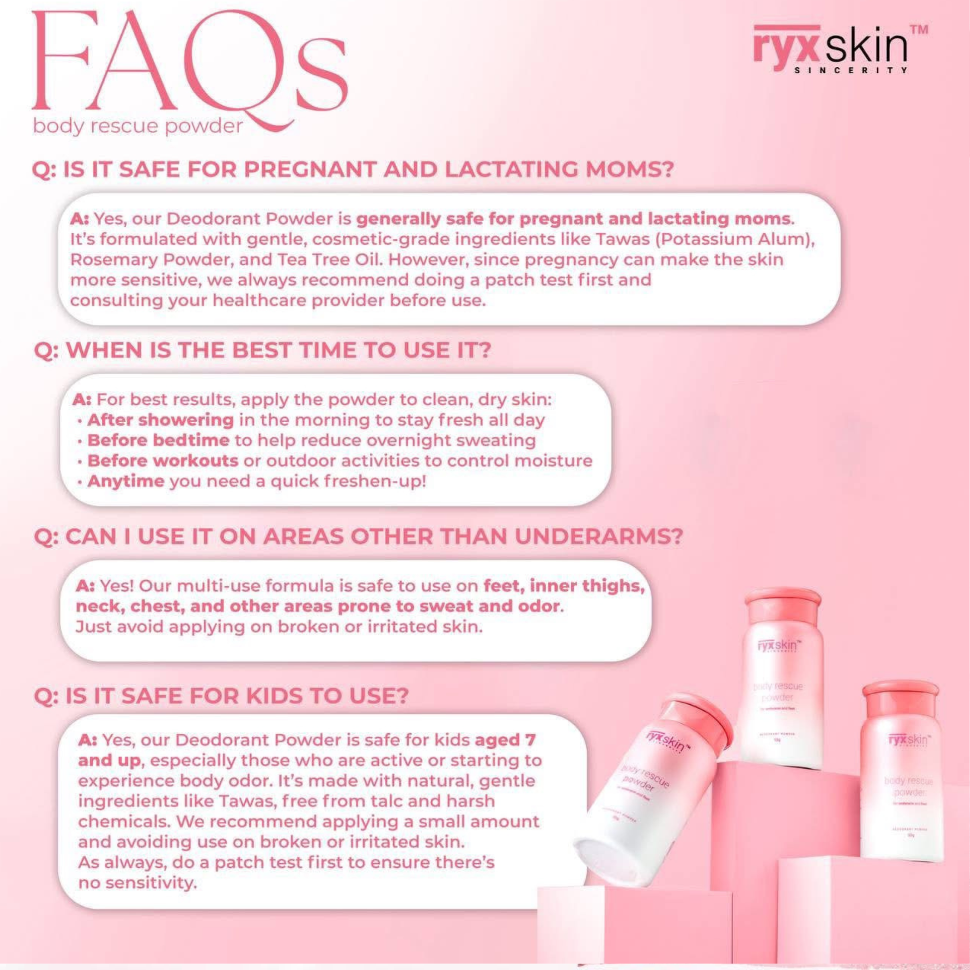 Stay fresh and confident all day with Ryx Skin Body Rescue Deodorant Powder, a natural solution designed to control sweat and odor while keeping your skin dry and comfortable. This lightweight powder absorbs moisture effectively, preventing discomfort in areas like the underarms, feet, inner thighs, back, neck, and underboob. Its gentle, paraben-free formula is safe for sensitive skin and suitable for everyday use. Enriched with natural deodorizing ingredients, it neutralizes odor without clogging pores or causing irritation. The silky texture leaves your skin smooth and breathable, providing a clean, refreshed feel. Ideal for active days, it helps minimize chafing and friction for lasting comfort. With Ryx Skin Body Rescue Deodorant Powder, you can stay confidently fresh no matter where the day takes you.