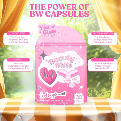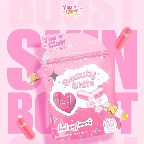 Reveal your most radiant glow with You Glow Babe Beauty White, a premium glutathione supplement designed to brighten, rejuvenate, and nourish your skin from within. Each capsule combines the power of Glutathione, Hydrolysed Collagen, Vitamin C, and Alpha Lipoic Acid to promote a lighter, smoother, and more youthful complexion. It helps fade dark spots, reduce fine lines, and improve skin elasticity for a visibly firmer and healthier look. Vitamin E and Grape Seed Extract provide antioxidant protection, while Garcinia Cambogia supports fat metabolism and appetite control. Enriched with NAC (N-Acetyl-L-Cysteine), it enhances detoxification and boosts glutathione levels for clearer, glowing skin. This all-in-one supplement also strengthens hair and nails, giving you a complete beauty boost from the inside out. Experience the confidence of radiant, even-toned, and youthful-looking skin with You Glow Babe Beauty White.